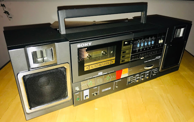 1986年発売。MADE IN JAPAN。ソニー製のシンプルなWカセット仕様のラジカセ。四角いボディに刻まれた「D・O・U・B・L・E」の表記と明るめなポイントカラーに時代を感じる!上部のプラスチックボタンの質感がチープでかわいい。マイク入力はあるけど、外部入力端子はないのでご注意を。