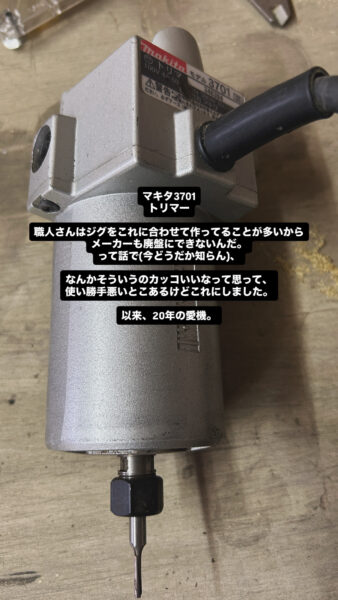 木材に穴を掘る道具、でっかいのがルーター、ちっさいのがトリマーっていうんですけど、僕はどちらもマキタの銀色のレガシーなモデルを使ってます。