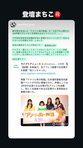 そして、アカデミー賞にもノミネートされ、国内吹き替え版も制作され、その公開舞台挨拶にまちこが登壇するというイベントが発生!